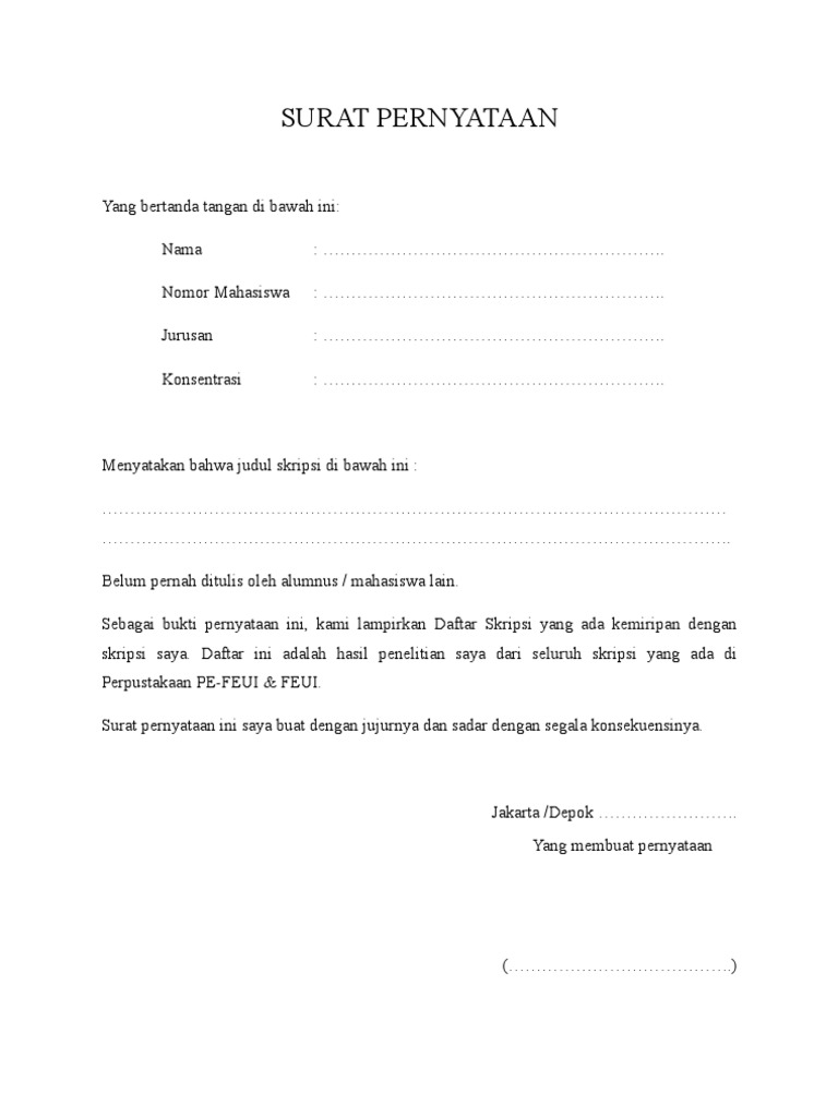 Contoh Surat Pernyataan Skripsi : Perfect Contoh Surat Pernyataan Skripsi 66 Tentang Membuat Surat Pernyataan Unik Oleh Post Contoh Surat Pernyataan Skripsi Gawe Cv - Contoh surat pernyataan salah transfer uang bank perusahaan dan pribadi january 24th 2018 contoh surat surat pernyataan transfer uang kini semakin dipermudah dengan banyaknya layanan yang ditawarkan.. Mencari contoh surat pernyataan kerja yang baik dan benar? Skripsi ini adalah asli dan belum pernah diajukan untuk mendapatkan gelar akademik sarjana, baik di universitas putera batam maupun di perguruan pernyataan ini saya buat dengan sesungguhnya dan apabila di kemudian hari terdapat penyimpangan dan ketidakbenaran dalam pernyataan ini. Isi dari surat pernyataan ini biasanya isi dari surat pernyataan ini biasanya berkaitan dengan keaslian tulisan yang dibuat dalam skripsi tersebut. Surat pernyataan pada dasarnya dibuat untuk memperkuat pernyataan lisan agar memiliki payung hukum. Sedang melakukan perjanjian kesanggupan dengan pihak lain, namun bingung formatnya seperti apa?